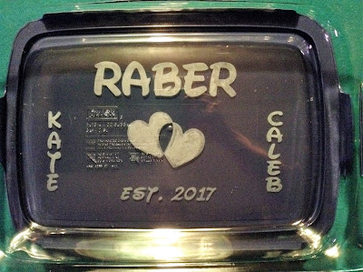 The first of our 18 great-nieces & nephews is getting married. Her sister is having a luncheon honoring the bride-to-be. I bought these items off her registry and then glass etched them making stencils with my Cricut. I put the casserole dish in an insulated carrier with a couple of dish towels also from her registry.